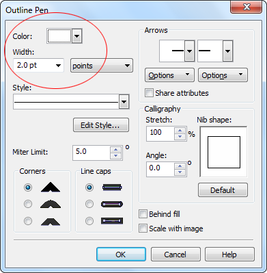- Buat objek lingkaran yang baru dengan ukuran 11 cm x 11 cm. Tekan F12. Dalam kotak dialog Outline Pen, pilih Color dengan warna putih dan isi Width: 2.0 pt. Tekan OK. Setelah itu tekan P untuk menempatkannya di tengah kanvas kerja.