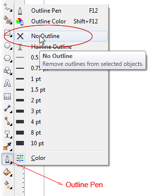 - Pilih Pick Tool di Toolbox. Klik objek lingkaran, kemudian klik Outline Pendan pilih No Outline untuk menghilangkan outline lingkaran.